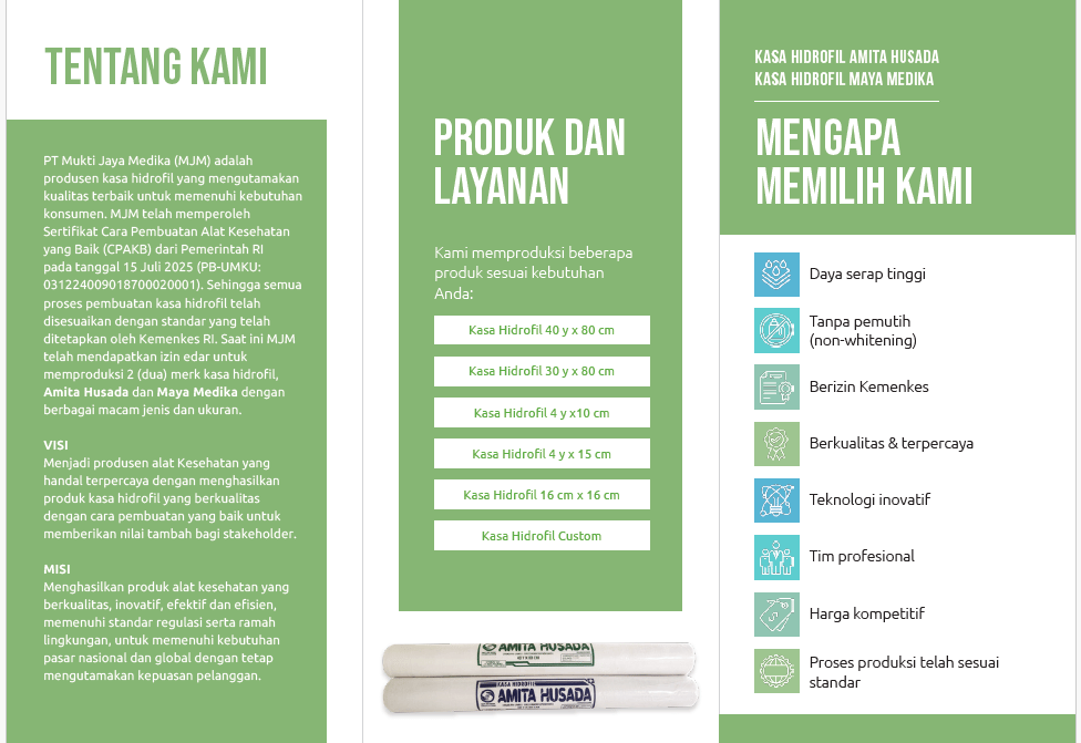 PT Mukti Jaya Medika atau MJM adalah produsen kasa hidrofil yang mengutamakan kualitas terbaik untuk memenuhi kebutuhan konsumen. MJM telah memperoleh Sertifikat Cara Pembuatan Alat Kesehatan yang Baik dengan nomor izin 031224009018700020001 serta Izin Distributor Alat Kesehatan dengan nomor izin 03122400901870001 dari Pemerintah Republik Indonesia. Selain itu MJM juga telah mendapatkan sertifikasi halal atas produk Kasa Hidrofil Amita Husada dan Maya Medika dengan No. ID33110035113851125.